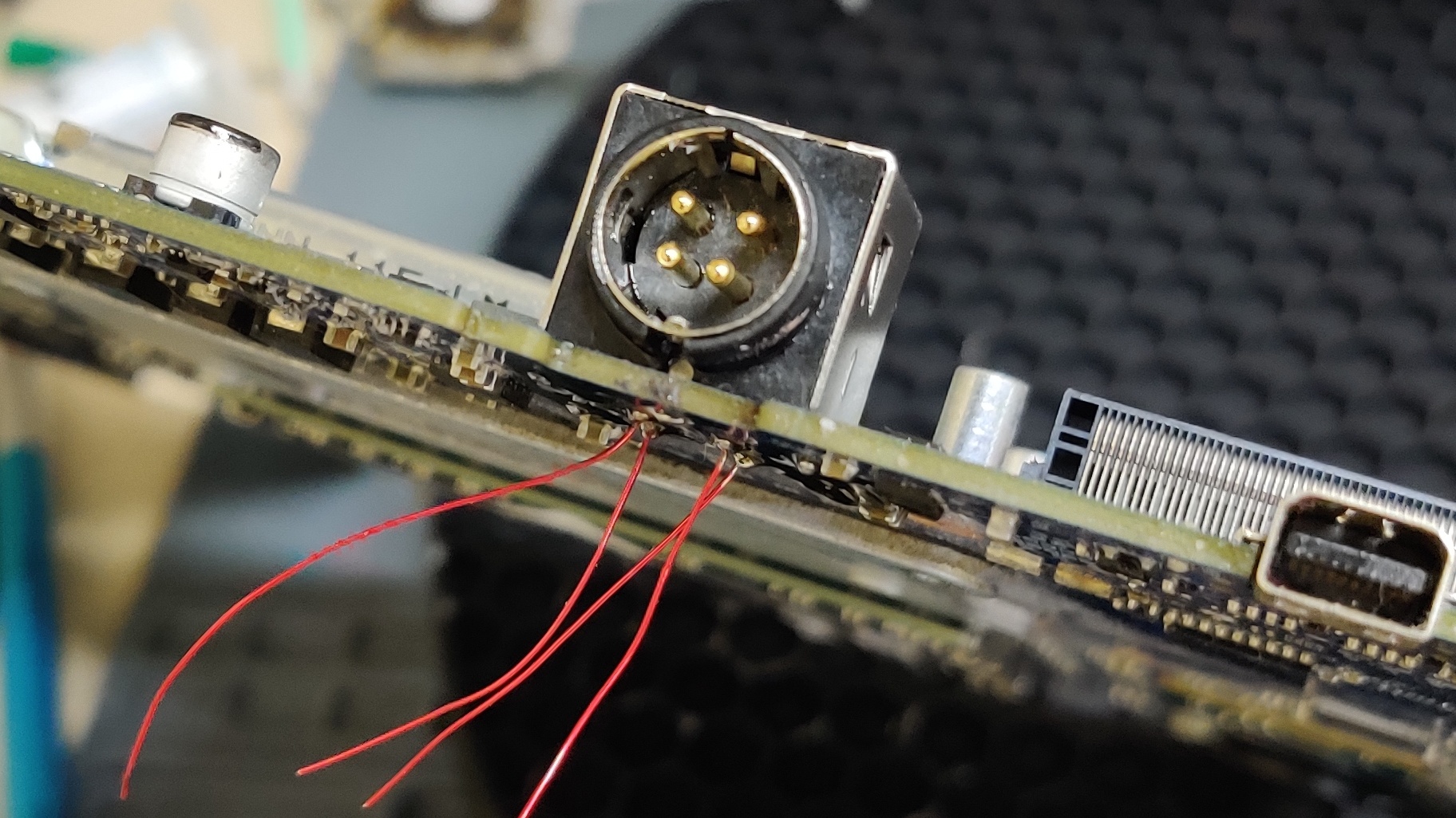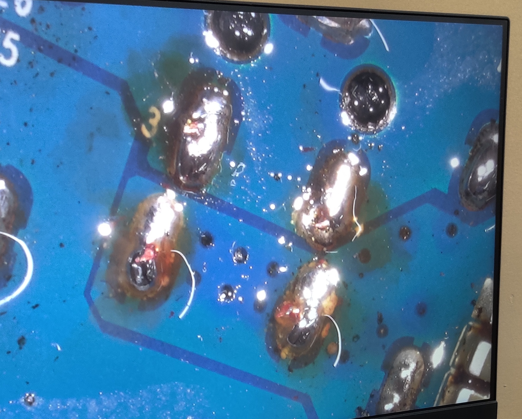 We take our dremmel and file down the pin package to just the metal contacts and solder wire to them creating new shielded contacts.  We then run these throughhole and solder the anchor joints.  Now we solder each individual wire checking for continuity after each one.  Success!  Trim the wires and off to the next repair!